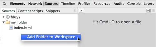 Drugi deo postupka je vezan za fajlove pojedinjačno. Koristeći sledeći postupak povezujemo odredjeni fajl sa browser-om. Nakom toga svi fajlovi mogu da se modifikuju iz source panela, pa čak i css fajlovi direktno iz Elements/Styles panela.- Right-click or Control+click on a file in the Sources left-side panel.